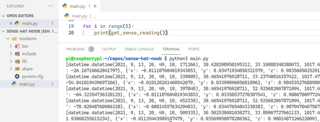We add a for loop to our code to call the get_sense_readingfunction a few times are print the results to the terminal window. We can run the program (main.py) by calling the Python 3 interpreter and passing the file name to it. That loads the code, executes the loop, prints the results.