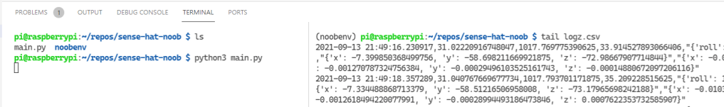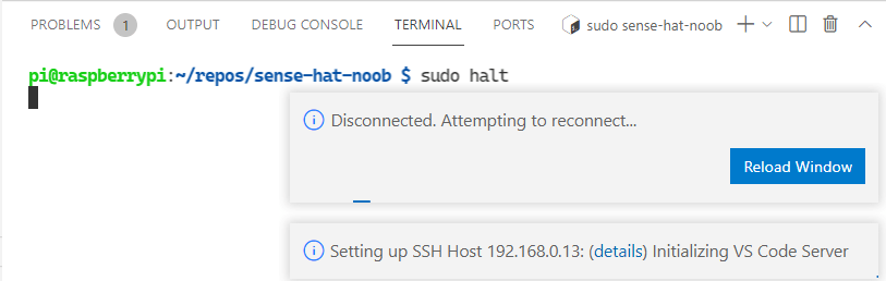 Looks like that worked 🙂 The connection got terminated and VS Code detects that, and tries to reconnect. Pretty slick. We managed to start putting new Python skills to use. Learnt how to create a virtual environment for better package management. Then collecting and writing telemetry from the SenseHat to local storage on the Pi.