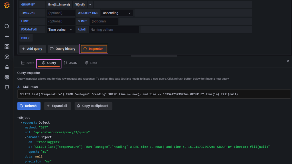 One thing I wasn’t quite sure of is the way that the time range worked in Grafana with the data logged in the database. The query looked correct but no data was returned. I was looking at a window from now-1d to now initially. It seemed logical to me, “find me all the data points from yesterday to now“. The Inspector in Grafana helps get the query and then we can use that to run the query in the Influx CLI to test the queries.